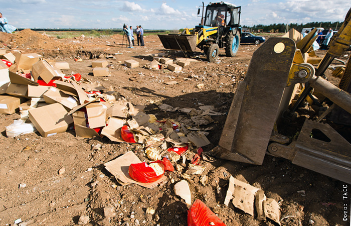 В четверг 6 августа в России начали уничтожать незаконно попавшую в страну санкционную продукцию. В Оренбурге было уничтожено 20 тонн санкционного сыра, произведенного в Латвии. Сыр был раздавлен бульдозером на полигоне твердых бытовых отходов в 10 км от города и помещен в специальную яму.