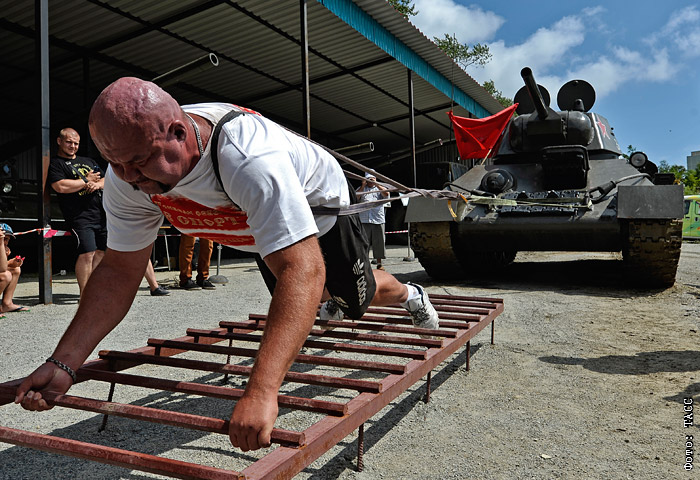 Многократный чемпион Приморья по пауэрлифтингу и тяжелой атлетике установил новый мировой рекорд, сдвинув с места на несколько метров легендарный танк Т-34 весом более 25 тонн