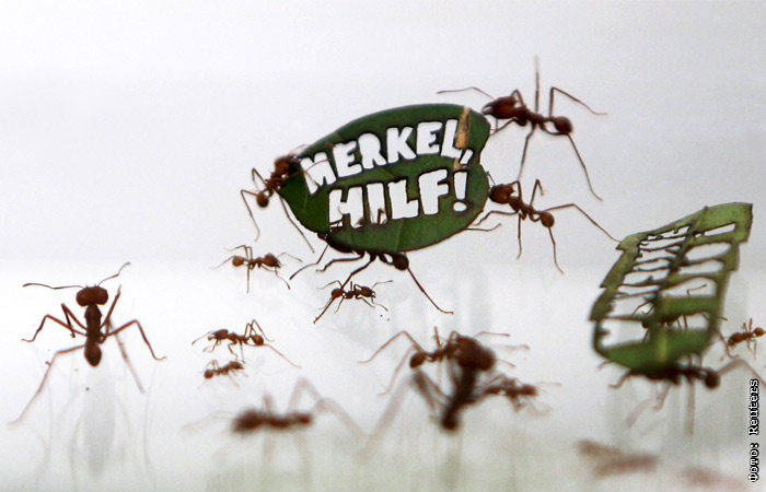 Муравьи несут лист с лозунгом "Меркель, помоги!" во время акции по защите тропических лесов Амазонки