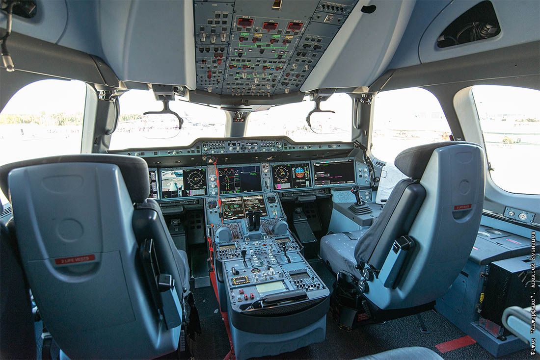 Кабина пилотов. Джойстики вместо штурвалов и экраны вместо традиционных "приборов".