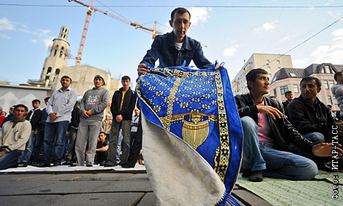 Мусульмане во время торжественного намаза по случаю праздника Ураза-байрам (Праздника разговения) в Соборной мечети.