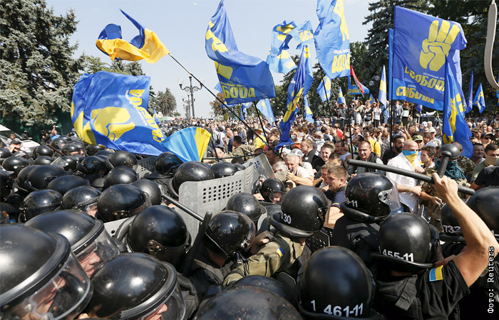 В Киеве у здания украинского парламента начались беспорядки после принятия в первом чтении законопроекта об изменениях в конституции, касающихся децентрализации страны. Площадь Конституции перед Радой окутана дымом от слезоточивого газа. Демонстранты бросают в силовиков бутылки, шашки и куски брусчатки. В ходе беспорядков около 100 сотрудников правоохранительных органов получили ранения, один из бойцов Нацгвардии скончался.