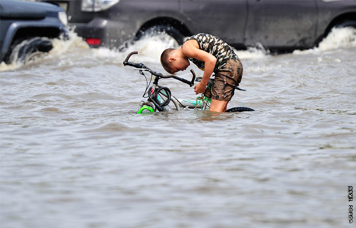 На одной из улиц Уссурийска, затопленных из-за сильных дождей и паводка