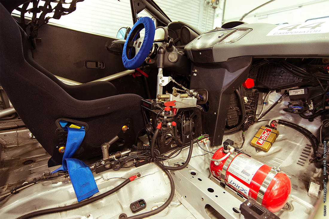 Гоночный автомобиль глубоко модифицирован внутри: ничего, привычного обычному автомобилю тут нет: практически все место в салоне занято каркасом безопасности, предусмотрены специальные системы аварийного пожаротушения, а традиционная внутренняя обшивка и элементы декора отсутствуют как класс. Мужская машина!
