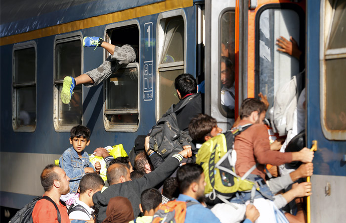 Мигранты штурмуют поезд на вокзале Келети в Будапеште