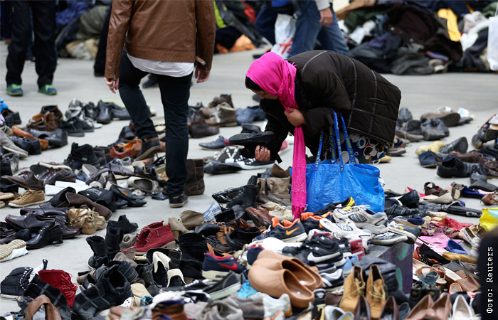 Женщина ищет обувь среди вещей, пожертвованных жителями в германском Дортмунде