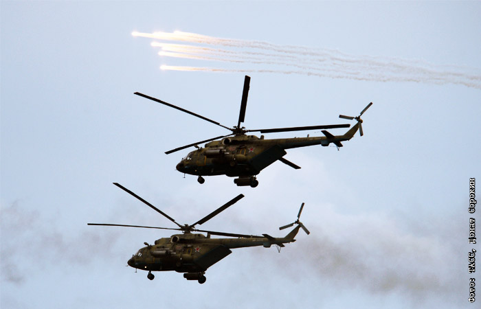 Вертолеты Ми-8 во время стрельб неуправляемыми ракетами