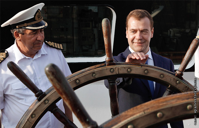Дмитрий Медведев во время посещения учебного парусного судна "Паллада"