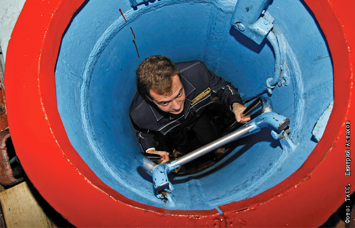 Дмитрий Медведев во время посещения атомного подводного крейсера стратегического назначения "Святой Георгий Победоносец" в бухте Крашенинникова