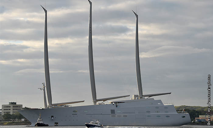 "Парусная яхта А", принадлежащая российскому миллиардеру Андрею Мельниченко, проходит испытания вблизи Киля на севере Германии
