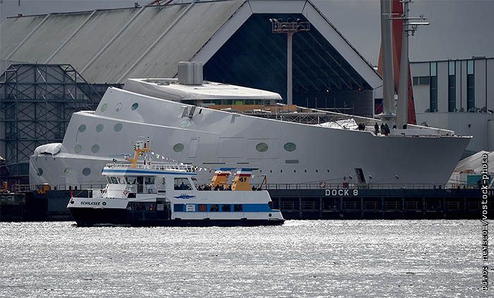 "Парусная яхта А", принадлежащая российскому миллиардеру Андрею Мельниченко, проходит испытания вблизи Киля на севере Германии