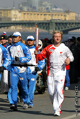 Спортсмен Евгений Плющенко на эстафете огня летней Олимпиады-2008