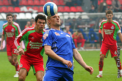 Железнодорожник Родолфу и игрок "Сатурна" Мартин Якубко (слева направо на первом плане) в матче чемпионата России по футболу: "Сатурн" (Московская область) – "Локомотив" (Москва) - 1:2