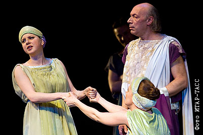 Фигуристка Ирина Слуцкая в роли Антигоны и актер Георгий Мельский в роли Креонта в спектакле режиссера Ники Косенковой "Антигона - Vsegda" на сцене Театрального Центра "На Страстном"