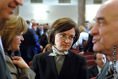 Глава МЭРТ Эльвира Набиуллина и научный руководитель государственного университета "Высшая школа экономики" Евгений Ясин перед началом заседания коллегии Минфина