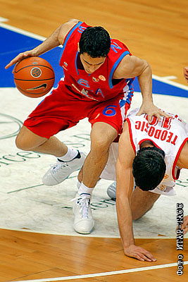 Армеец Николаос Зисис и игрок команды "Олимпиакос" Милош Теодосич (слева направо) в матче 1/4 финала Евролиги УЛЕБ по баскетболу: ЦСКА (Россия) –"Олимпиакос" (Греция)