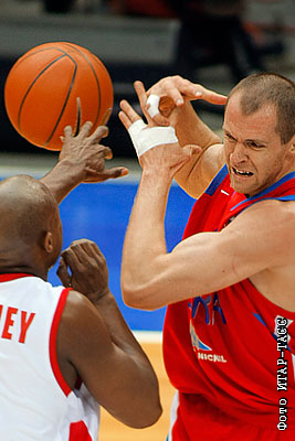 Игрок команды "Олимпиакос" Родерик Блэкни и армеец Рамунас Шишкаускас (слева направо) в матче 1/4 финала Евролиги УЛЕБ по баскетболу: ЦСКА (Россия) –"Олимпиакос" (Греция)