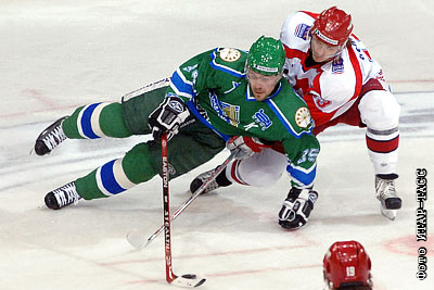 Игроки команды "Салават Юлаев" Владимир Антипов и команды "Локомотив" Иван Непряев (слева направо) в финальном матче чемпионата России по хоккею: "Локомотив" (Ярославль) - "Салават Юлаев" (Уфа). "Локомотив" - "Салават Юлаев" - 1:0