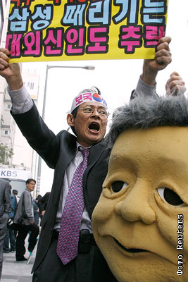 Возмущение народа Южной Кореи вызвала новость о крупных взятках компании Самсунг. Плакат гласит: "Самсунг подрывает экономику страны"
