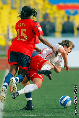 Армеец Чиди Одиа и игрок "Спартака" Гогита Гогуа (слева направо) в матче чемпионата России по футболу ЦСКА (Москва) - "Спартак" (Нальчик) - 0:1