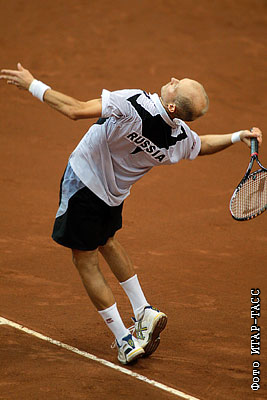 Российский теннисист Николай Давыденко в матче 1/4 финала Кубка Дэвиса, в котором он победил чешского теннисиста Томаша Бердых