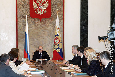 Президент России Владимир Путин (в центре) на совещании с членами правительства РФ в Кремле