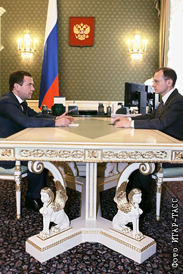 Избранный президент России Дмитрий Медведев и генеральный директор государственной корпорации "Росатом" Сергей Кириенко (слева направо) на встрече в Кремле.