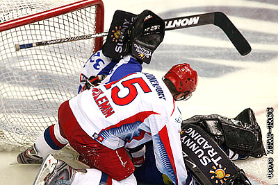 Игроки сборных России Николай Кулемин (на первом плане) и Финляндии вратарь Синухе Валлинхеймо в матче последнего чешского этапа Еврохоккейтура, "Кубка Ческа Пойиштовна", между сборными России и Финляндии. Россия – Финляндия - 4:1