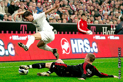 Игроки "Зенита" Радек Ширл и "Баварии" Лукас Подольски (слева направо) в матче 1/2 финала Кубка УЕФА по футболу: "Бавария" (Германия) – "Зенит" (Россия) – 1:1