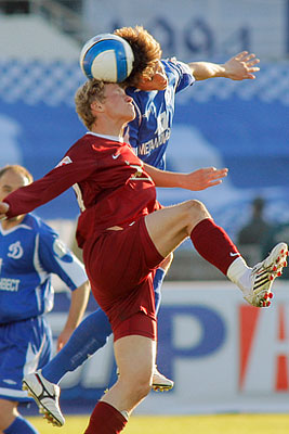 Игрок "Рубина" Евгений Баляйкин и игрок "Динамо" Кирилл Комбаров (слева направо) в матче чемпионата "Динамо" (Москва) - "Рубин" (Казань) - 0:2