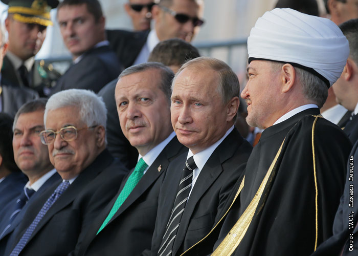 Первый заместитель руководителя администрации президента РФ Вячеслав Володин, президент Палестины Махмуд Аббас, президент Турции Реджеп Тайип Эрдоган, президент России Владимир Путин и председатель совета муфтиев России Равиль Гайнутдин (слева направо)