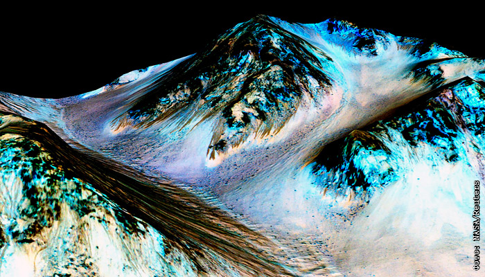Темные подтеки на склонах, которые, как полагают ученые, оставлены существующей на Марсе соленой водой в жидком состоянии