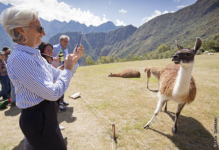Глава международного валютного фонда Кристин Лагард фотографирует ламу во время своего тура по Мачу-Пикчу