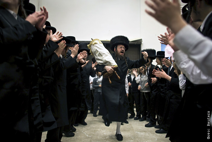Ультраортодоксальный еврей танцует со свитком Торы во время празднования Симхат Тора в иерусалимской синагоге