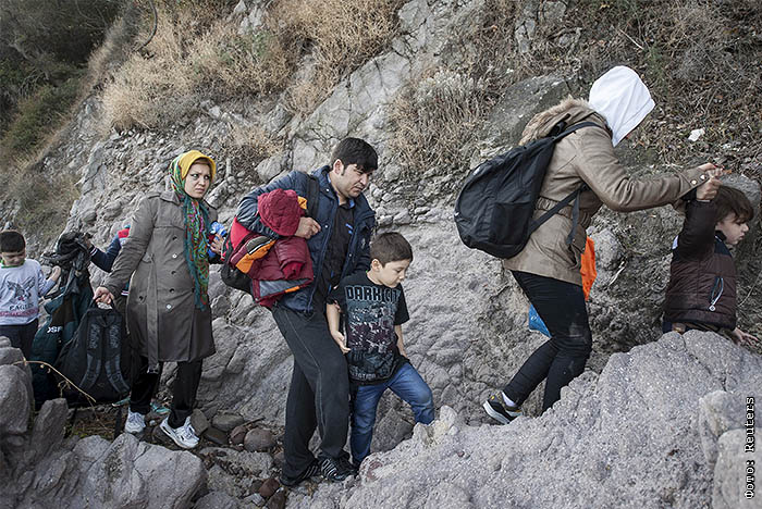 Беженцы из Афганистана поднимаются по скалистому пляжу спустя несколько минут после прибытия на лодке на греческий остров Лесбос