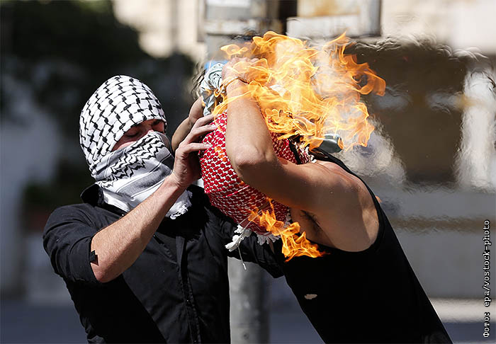 Один из палестинский бунтарей поджег сам себя, когда пытался кинуть "коктейль Молотова" в бойцов вооруженных сил Израиля