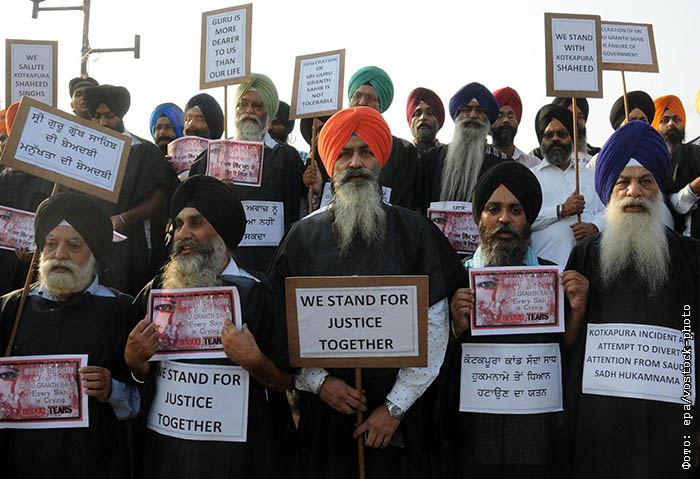 Сикхи в Амритсаре, Индия, протестуют и требуют справедливости после того, как была осквернена одна из копий их священной книги, что привело к беспорядкам и столкновениям с полицией, в результате чего двое людей погибли