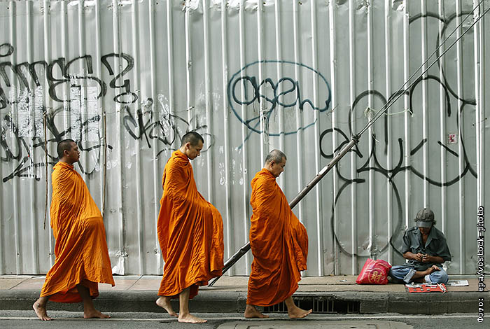 Монахи бредут мимо продавца амулетов по утреннему Бангкоку