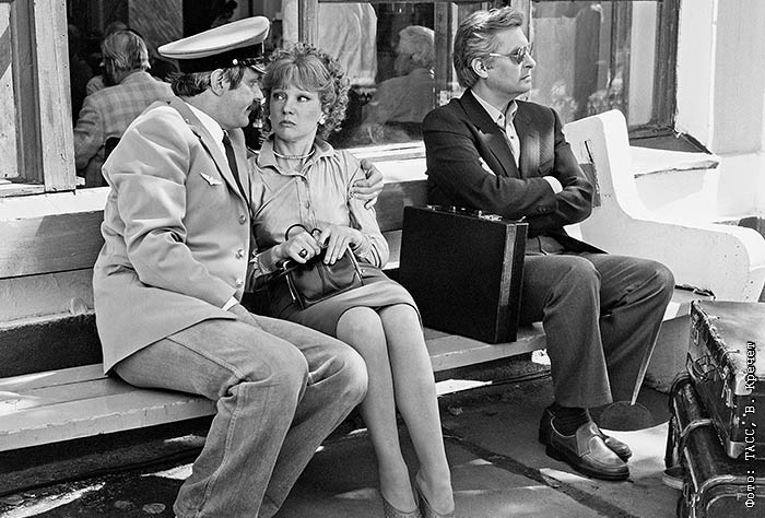 1983 год. Никита Михалков (проводник), Людмила Гурченко (Вера) и Олег Басилашвили (Рябинин) в фильме режиссера Эльдара Рязанова "Вокзал для двоих".