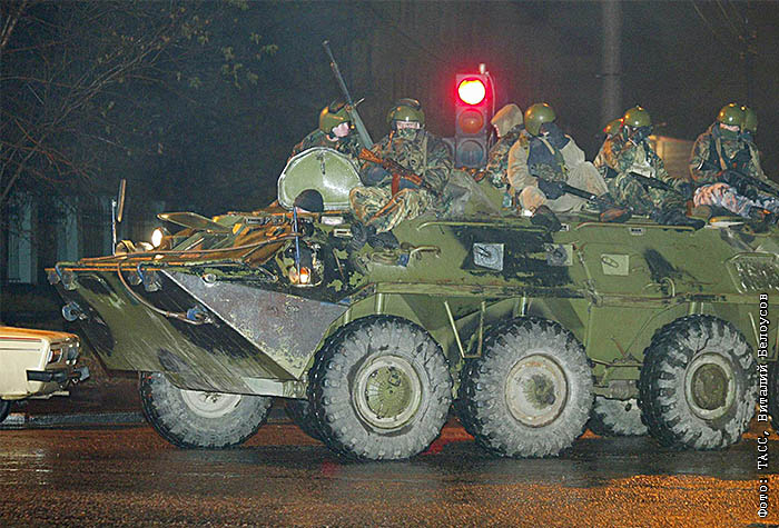 На фото: Бронетехника, стянутая в переулки, находящиеся вблизи здания ДК ГПЗ "Шарикоподшипник" на улице Мельникова. 2002 год.