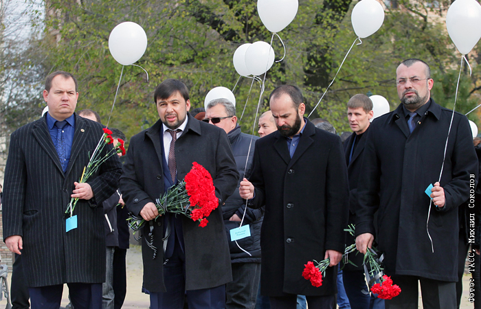 Заместитель председателя народного совета Донецкой народной республики Денис Пушилин (второй слева) возлагает цветы в память о погибших пассажирах рейса Шарм-эль-Шейх - Санкт-Петербург