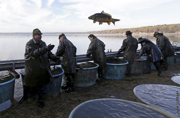 Традиционная ловля рождественского карпа в окрестностях чешского города Тршебонь