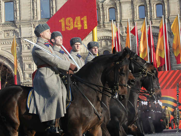 Кавалеристы во время марша, посвященного 74-й годовщине военного парада 7 ноября 1941 года