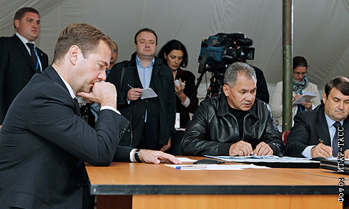 Дмитрий Медведев, глава МЧС РФ Сергей Шойгу и министр транспорта РФ Игорь Левитин (слева направо за столом) во время оперативного совещания о ходе расследования обстоятельств крушения пассажирского самолета Як-42, в результате которого погибла команда ярославского хоккейного клуба "Локомотив".