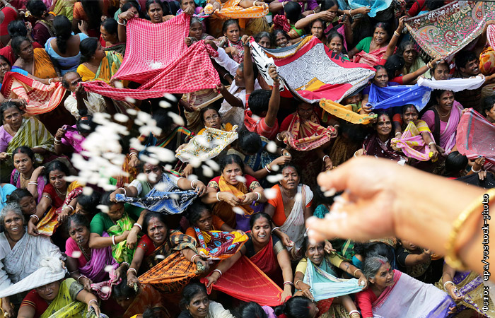 В Калькутте проходит праздник Аннакут. После молитв и поклонений божествам, верующие стремятся получить немного риса, освященного на вершине храма.