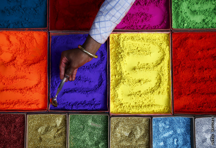Торговля разноцветными порошками для индуистского праздника Дивали в Непале