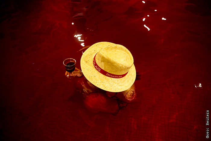 Купель с горячей водой винного цвета в бальнеологическом комплексе японского курорта Хаконэ, окрашенной по случаю открытия сезона Божоле-нуво