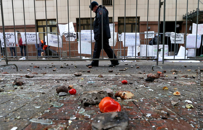 Около посольства Турции в Москве прошла акция протеста в связи с атакой турецких ВВС на российский боевой самолет Су-24 в Сирии. Демонстранты забросали здание посольства камнями, яйцами, помидорами и краской. Стекла второго и третьего этажей посольства были разбиты, камни попали в офисы сотрудников. Движение по переулку перекрыто, городские службы очищают тротуары и проезжую часть.