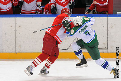 Игроки "Спартака" Иван Баранка и "Салавата Юлаева" Андрей Сидякин (слева направо) в матче чемпионата КХЛ: "Спартак" (Москва) - "Салават Юлаев" (Уфа) – 1:5