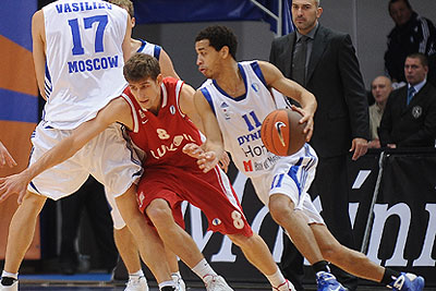 Игроки "Динамо" Юрий Васильев (слева), Джаннеро Парго (справа) и "Лукойла Академика" Чавдар Костов (в центре) в матче кубка Европы по баскетболу: "Динамо" (Москва) – "Лукойл Академик" (Болгария) – 94:78